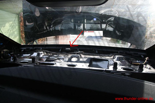 | Unter der Hutablage ist der Einbauort für die GPS-Antenne vorgesehen, da es aber sehr mühevoll ist die Ablage abzubekommen habe ich die Antenne vom Kofferraum aus durch ein kleines Loch geschoben und mit einem Klebeband fixiert. Beim Touring sitzt die Antenne übrigens im Heck-Spoiler! |