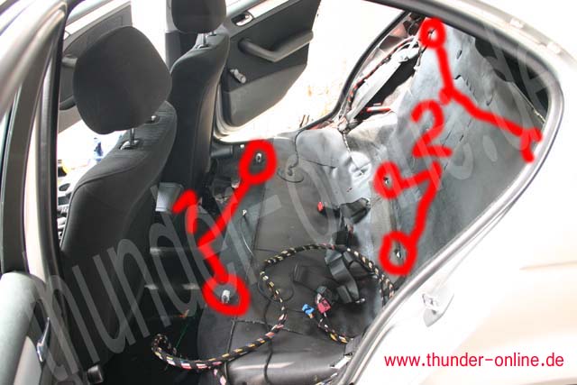 Rückbank unter Punkt 2 oben anpacken und nach vorne ziehen, ist sie entriegelt die Bank ein Stück nach oben bewegen da sie nur noch in den
