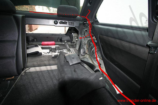 | Fahrer von Fahrzeuge mit werkseitig umklappbarer Rücksitzbank haben es etwas leichter, für die Verlegung muss nur die rechte Verkleidungsschale entfernt werden. |